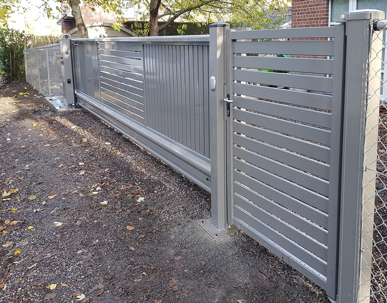1 | Combinaison d'un portail automatisé et un portillon de la gamme Aluette Twister en couleur gris quartz.